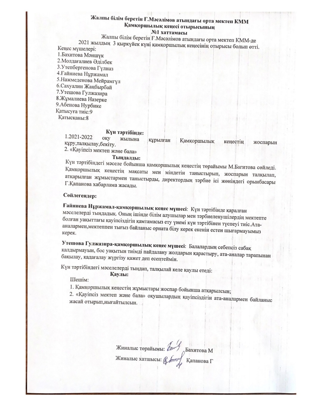 Қамқоршылық кеңес отырысының №1 хаттамасы