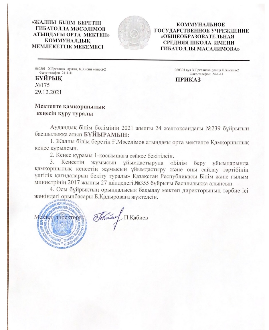 Мектепте қамқоршылық кеңесін құру туралы бұйрық