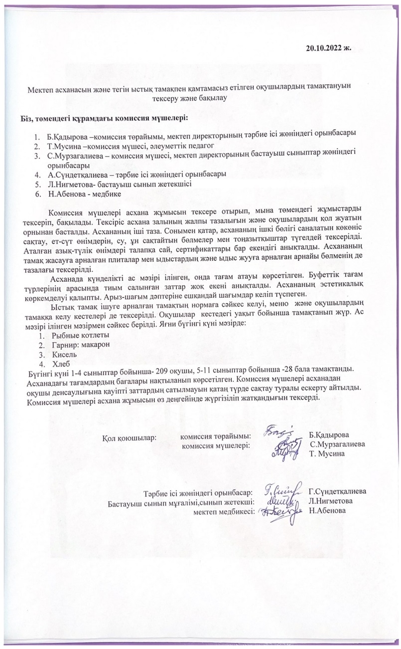 Мектеп асханасын және тегін ыстық тамақпен қамтамасыз етілген оқушылардың тамақтануы тексеру және бақылау