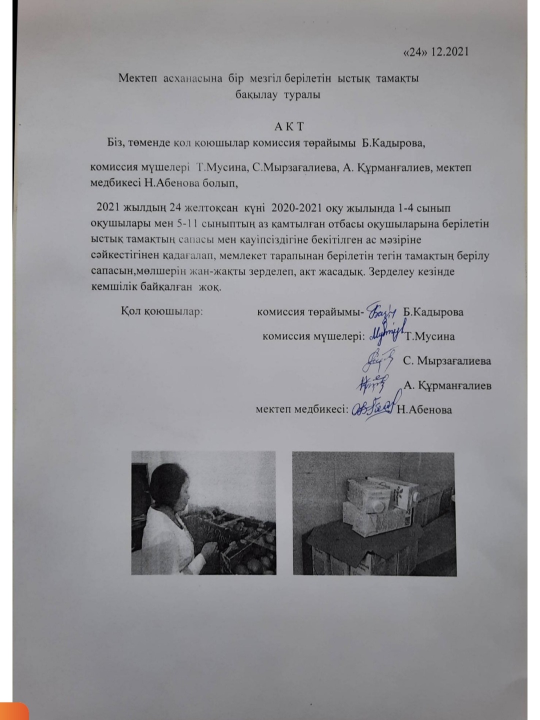 Мектеп асханасына бір мезгіл берілетін ыстық тамақты бақылау туралы акт