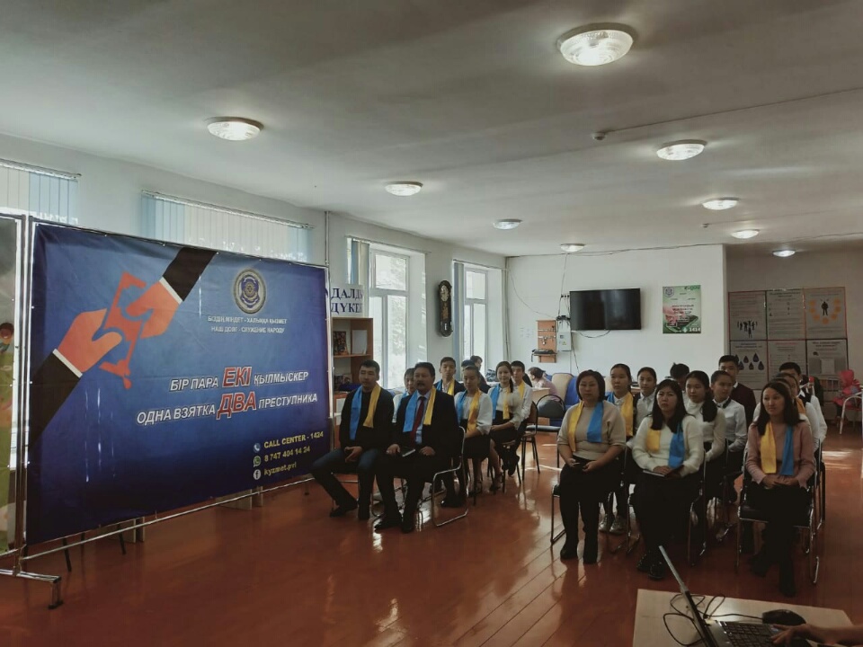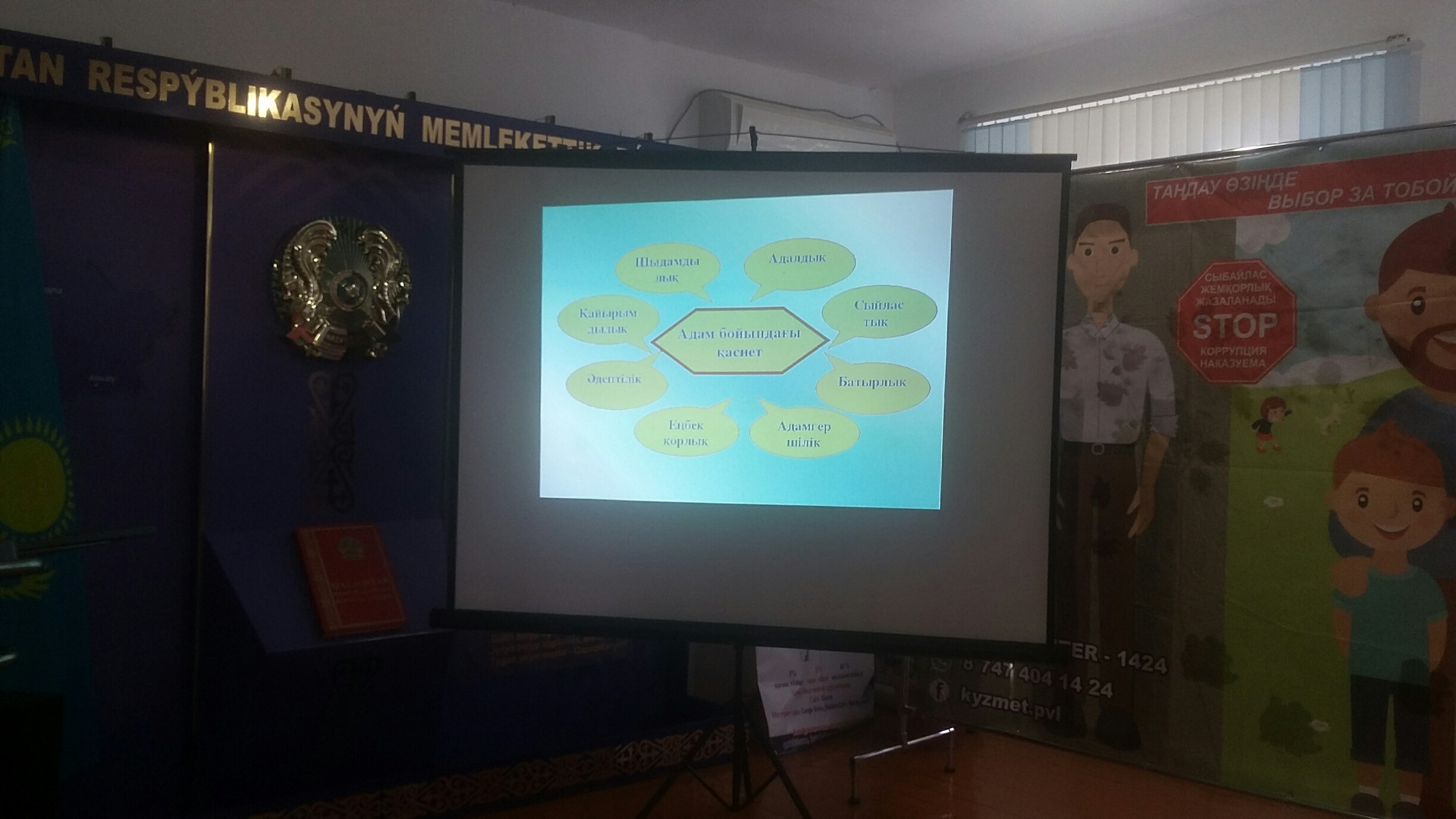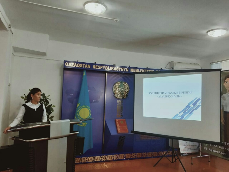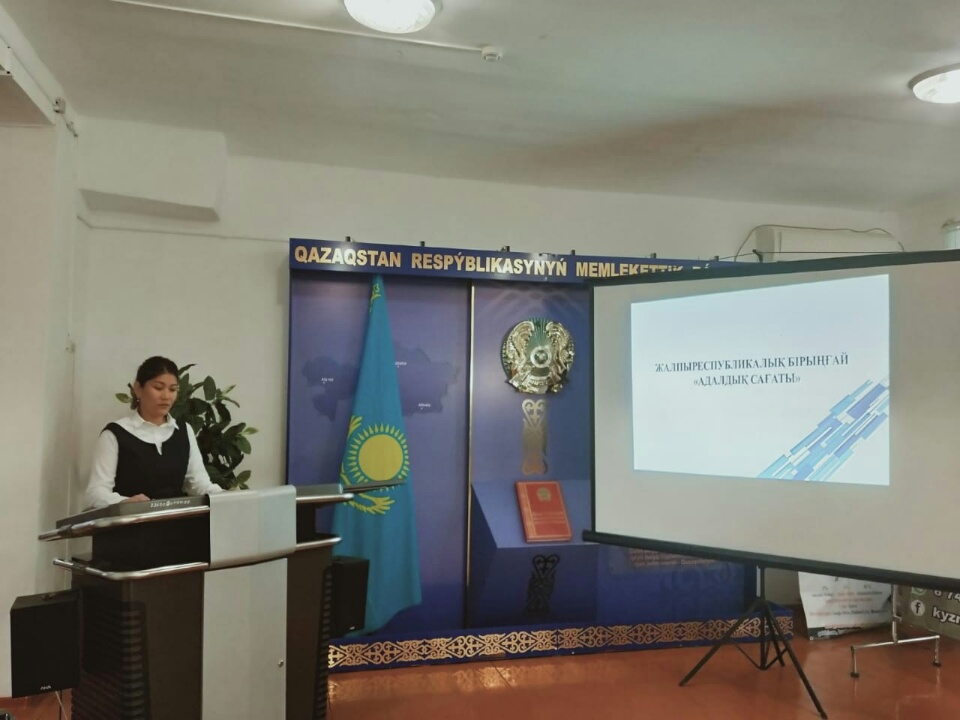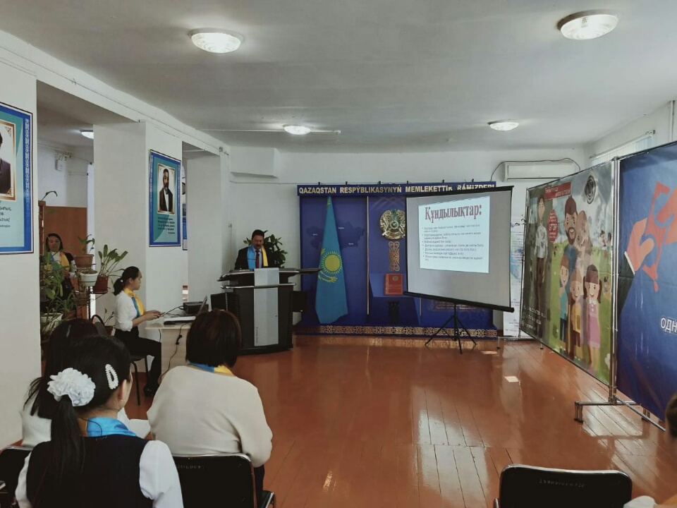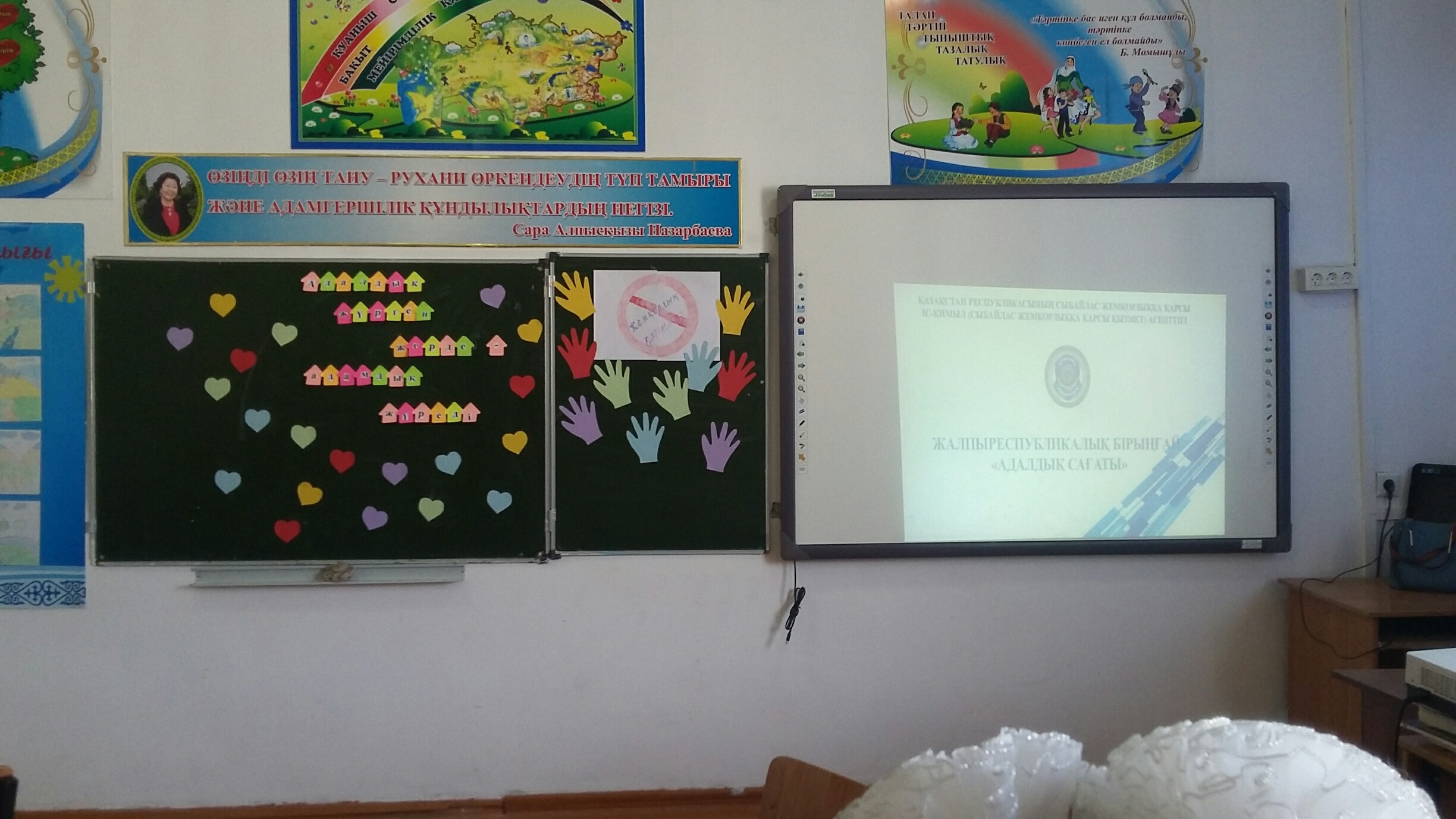 Мектебімізде 6қараша күні жалпы Республикалық Бірыңғай Адалдық сағаты өткізілген болатын. Шараның мақсаты - оқушыларды адалдыққа, адамгершілікке тəрбиелеу. Шараға мектеп оқушылары, мектеп директорының міндетін атқарушы Қабиев Парух Ғатауұлы, мектеп директорының тəрбие ісі жөніндегі орынбасарлары Қапанова Гүлмира Бекежанқызы, Қадырова Бактыгүл Нəбенқызы, мектеп психологы Еспусинова Гүлбану, əлеуметтік педагог Мусина Торғын Бекболатқызы, мектеп тəлімгері Мурзагалиева Лиза Əлібекқызы, дене тəрбиесі пəні мұғалімі Құрманғалиев Азамат, қазақ тілі мен əдебиеті пəні мұғалімі Сыралиева Инабат Сыралықызы қатынасты.
