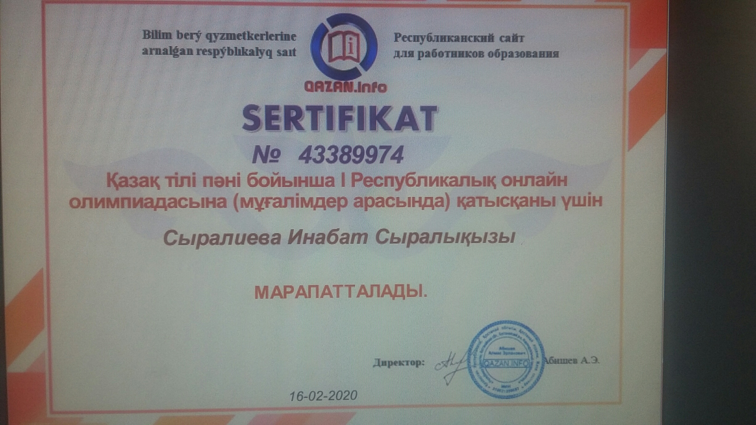 Қазақ тілі пəні бойынша І Республикалық онлайн олимпиадасына мектебіміздің қазақ тілі мен əдебиеті пəні мұғалімі Сыралиева Инабат Сыралықызы қатысып, сертификатпен жəне ІІІ дəрежелі дипломмен марапатталды