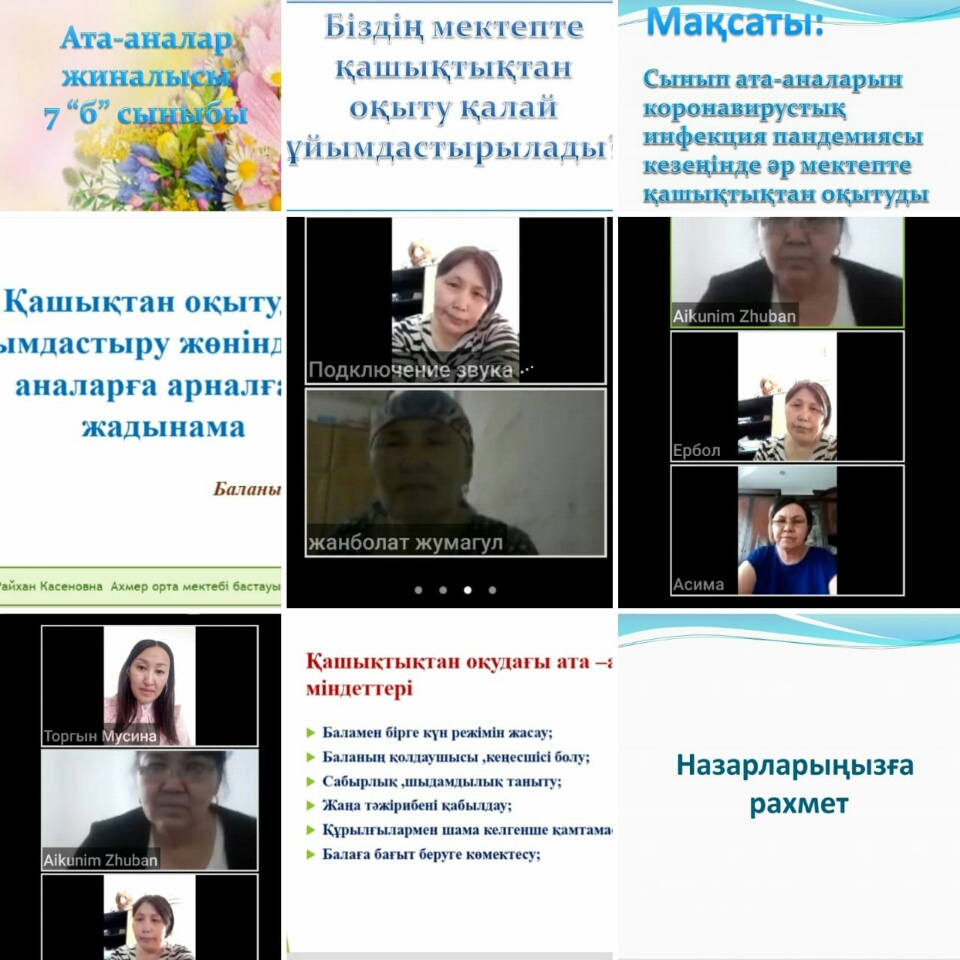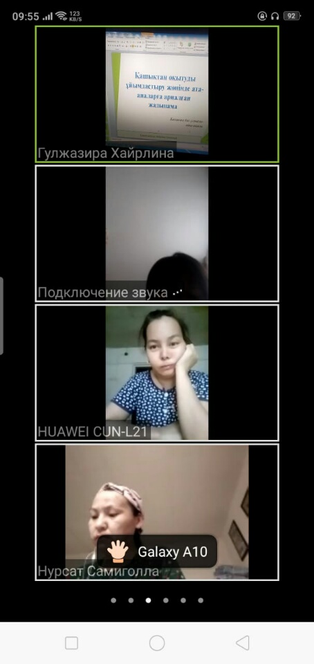2 - сəуір күні барлық сыныптарда " Қашықтықтан оқытуды ұйымдастыру жөнінде ата - аналарға арналған жадынама өткізілді. Мақсаты : Ата-аналарға қашықтықтан оқыту туралы түсінік жұмыстарын жүргізу. Сынып жетекшілер ата - аналарынатүсінік жұмыстарын жүргізіп, ата - аналар тақырып аясында сұрақтарын қойып, пікірлерін білдірді.