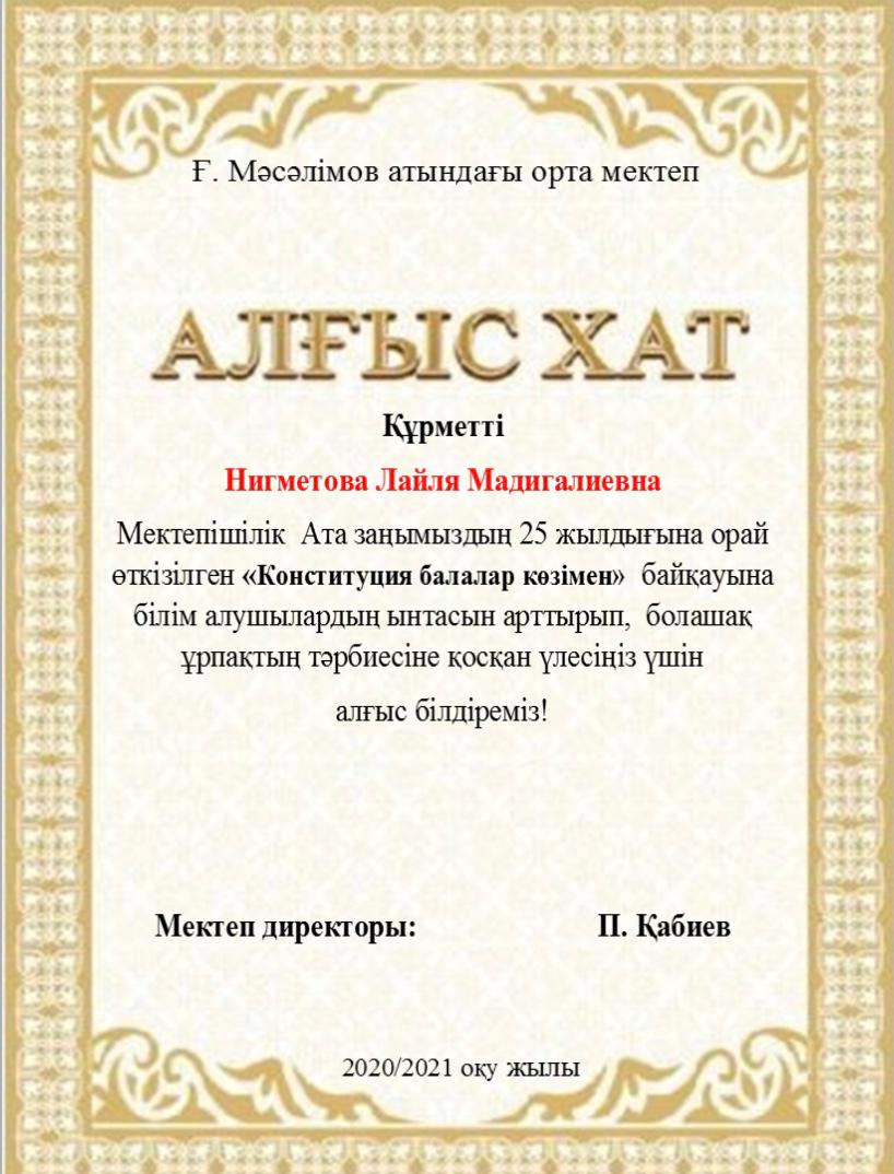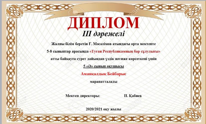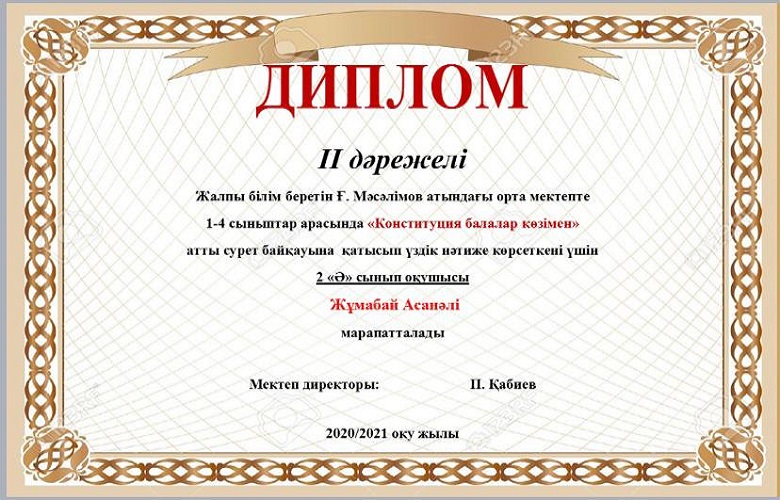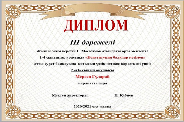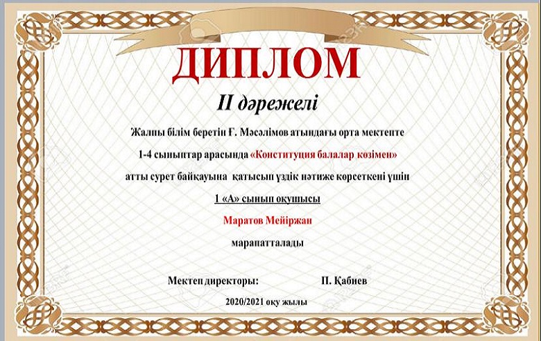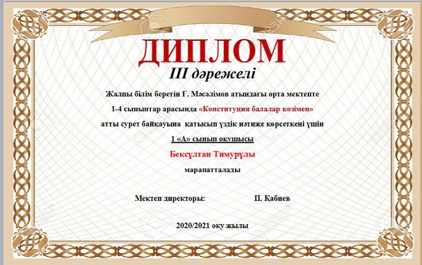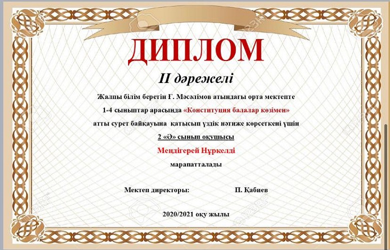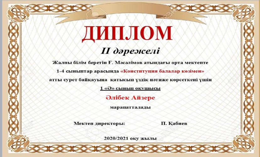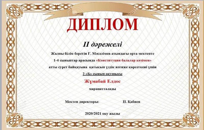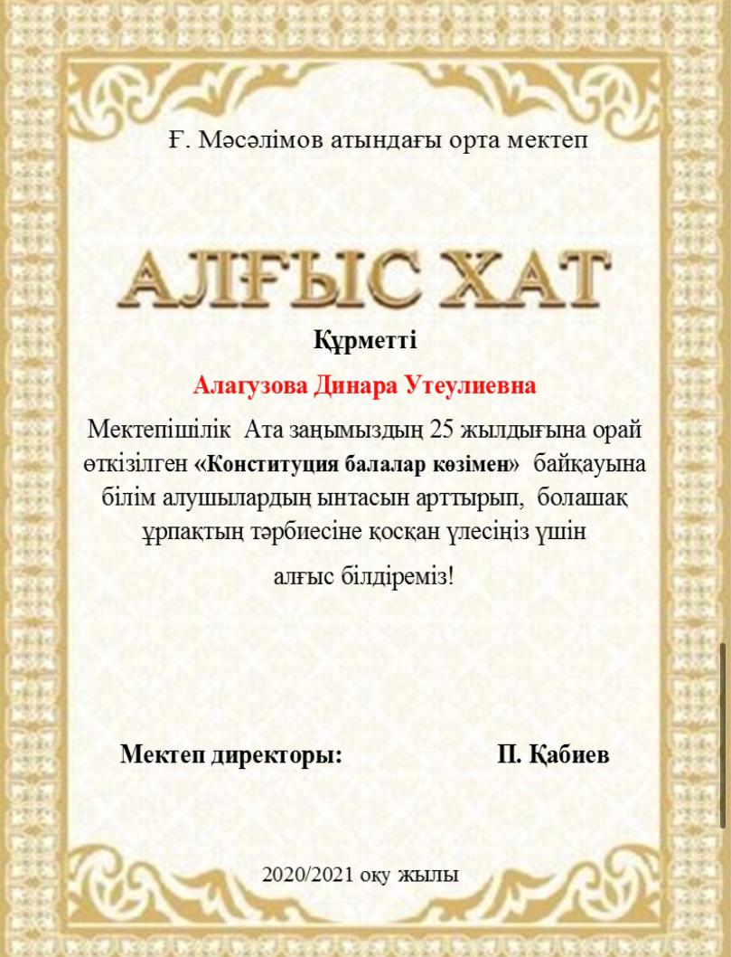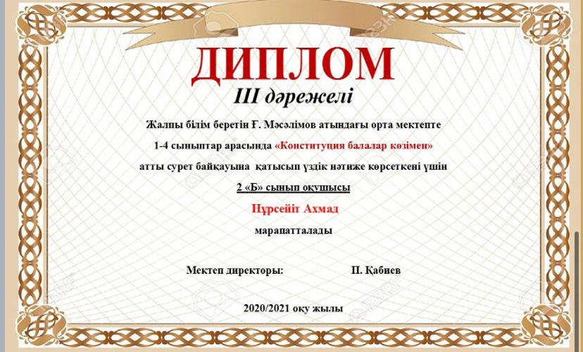 Мектебімізде Ата заңымыздың 25жылдығына орай 24-29тамыз аралығында өткізілген онлайн мектепішілік байқау өткізілген болатын. Нәтижесінде окушыларымыз 1,2,3 дәрежелі дипломдармен, сынып жетекшілері Алғыс хаттармен марапатталды. Мектеп ұжымы атынан жетістіктерімен құттықтаймыз!!!