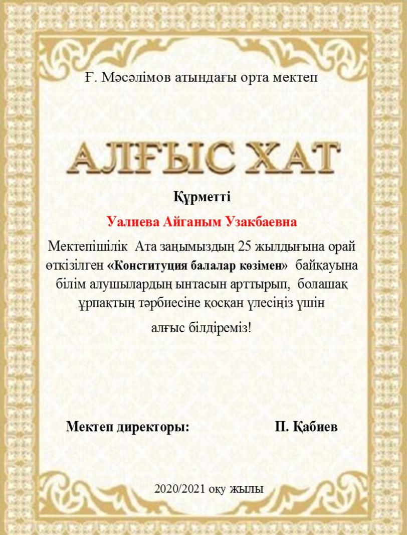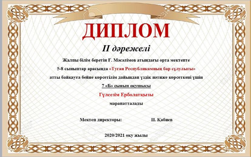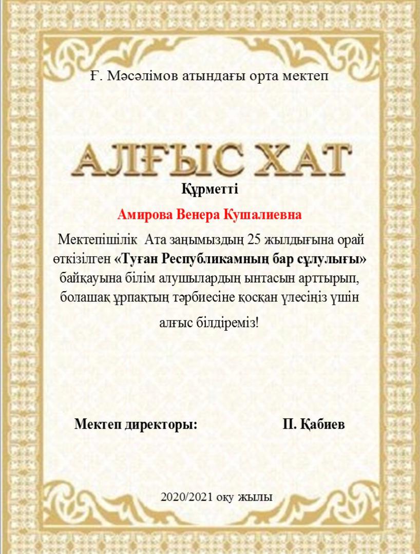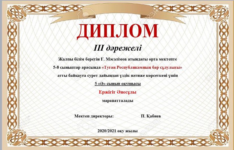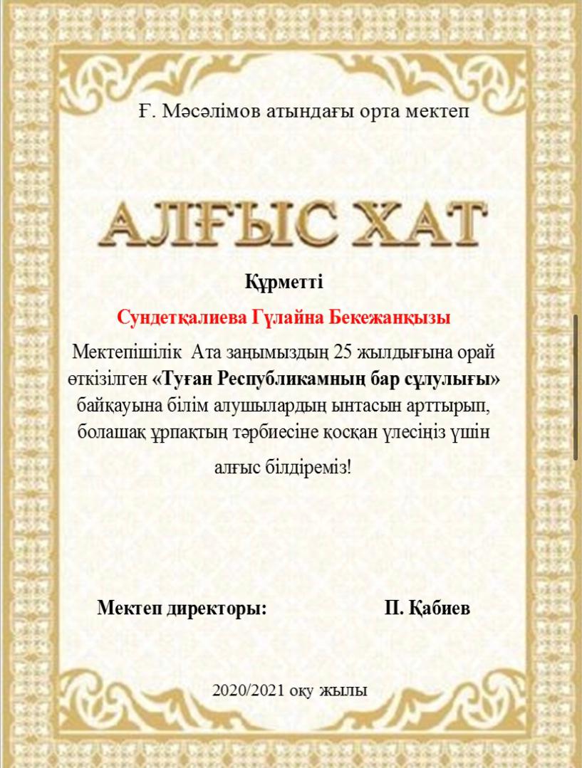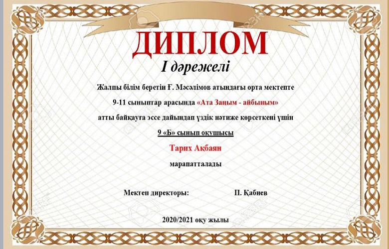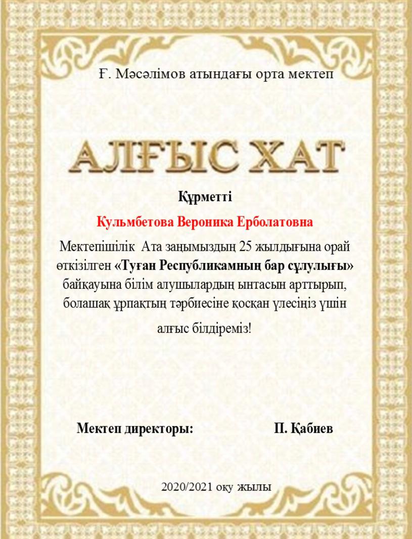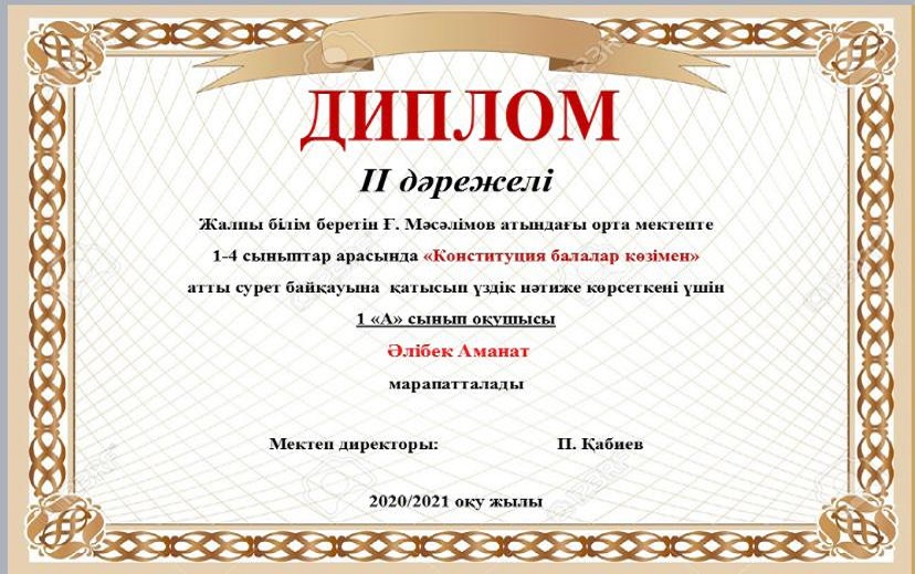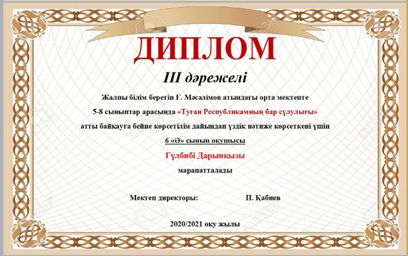 Мектебімізде Ата заңымыздың 25жылдығына орай 24-29тамыз аралығында өткізілген онлайн мектепішілік байқау өткізілген болатын. Нәтижесінде окушыларымыз 1,2,3 дәрежелі дипломдармен, сынып жетекшілері Алғыс хаттармен марапатталды. Мектеп ұжымы атынан жетістіктерімен құттықтаймыз!!!