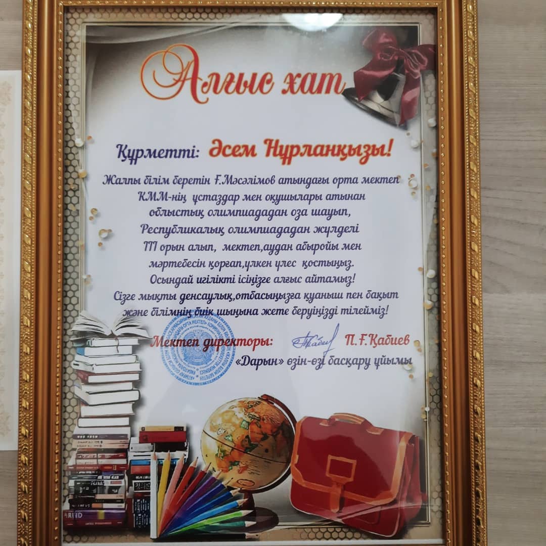 Жалпы білім беретін Ғибатолла Мәсәлімов атындағы орта мектеп КММ-нің 5"а"-сынып оқушысы Нұрланқызы Әсем 5-6 сыныптар арасында Қазақстан тарихы пәні бойынша аудандық олимпиадаға қатынасып, І-дәрежелі дипломмен, Республикалық олимпиадасына қатынасып, ІІІ-дәрежелі дипломмен марапатталды. Шәкіртіміз Нұрланқызы Әсемнің жеткен жетістіктерімен мектеп ұжымы атынан