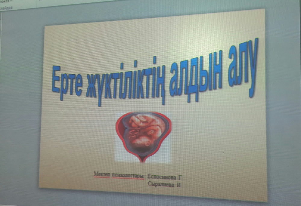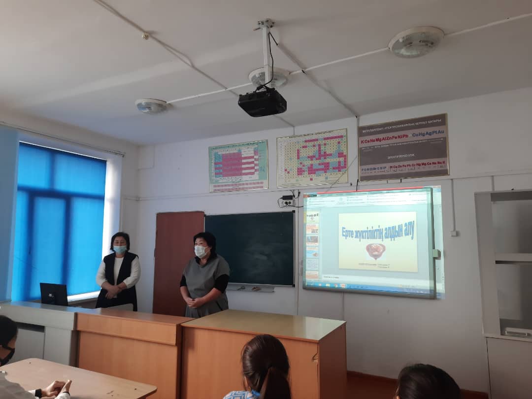 Ерте жүктіліктің алдын алу, әдет-ғұрыпты,салт-дәстүрді қыз баланың бойына сіңіре отырып, әдепті, сыпайы, адамгершілігі мол, білімді жан жақты жетілген қыз бала болуға тәрбиелеу мақсатында жалпы білім беретін Ғибатолла Мәсәлімов атындағы орта мектеп КММ-де мектеп директорының тәрбие ісі жөніндегі орынбасары мен мектеп психологінің ұйымдастыруымен жоғары сыныптың қыз балаларына "Ерте жүктіліктің алдын алу "тақырыбында түсіндірме жұмыстары жүргізілген болатын. Мұнда мектеп медбикесі қатысып, қыз балаларға тақырып аясында кеңестер берді.